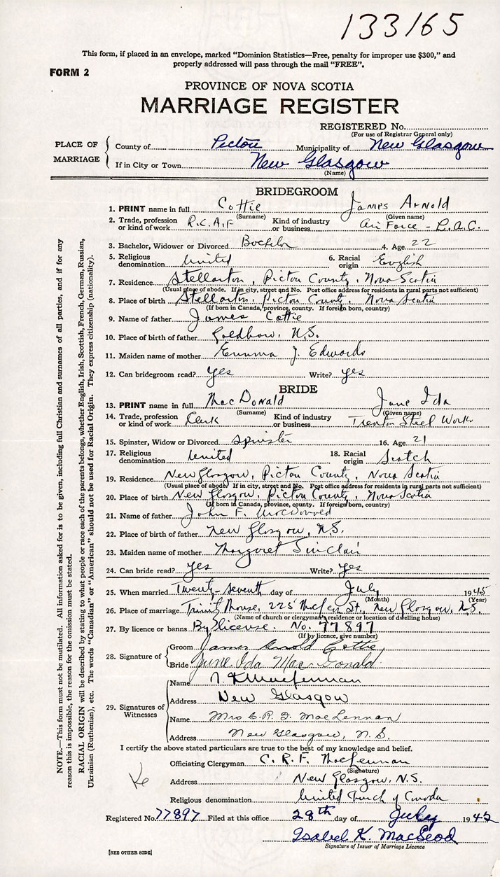 26. Place of marriage 225 MacLean Steet New Glasgow, Pictou County