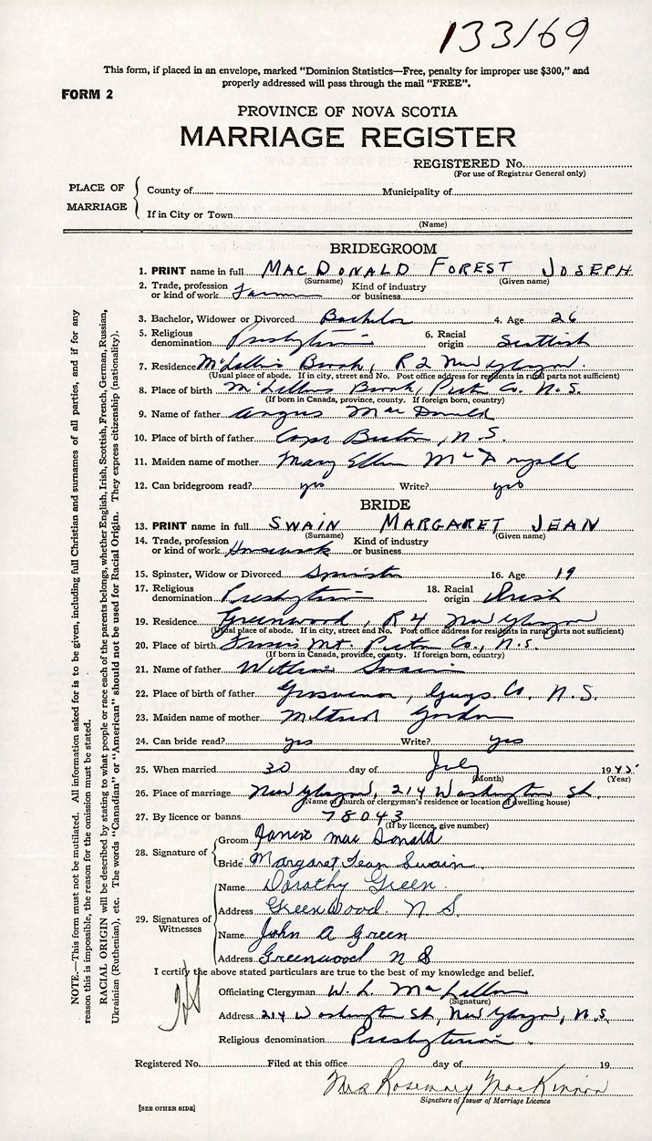 26. Place of marriage 214 Washington St New Glasgow , Pictou County