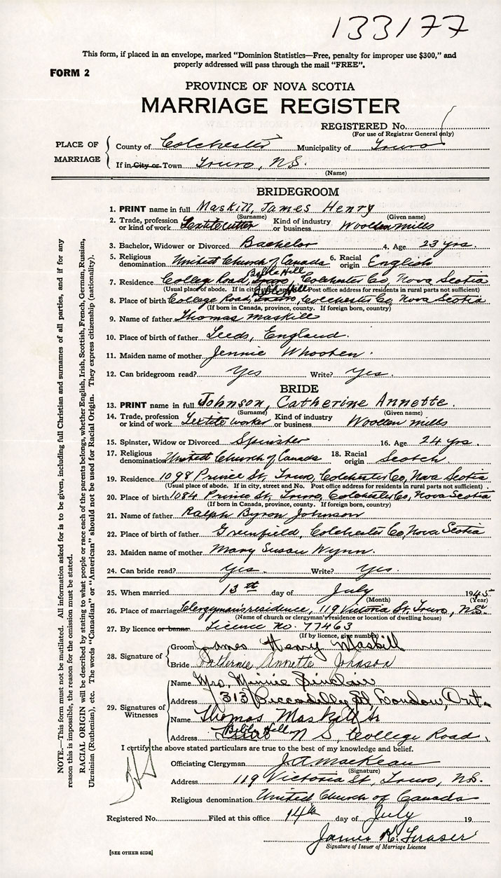 26. Place of marriage 119 Victoria Street Truro, Colchester County