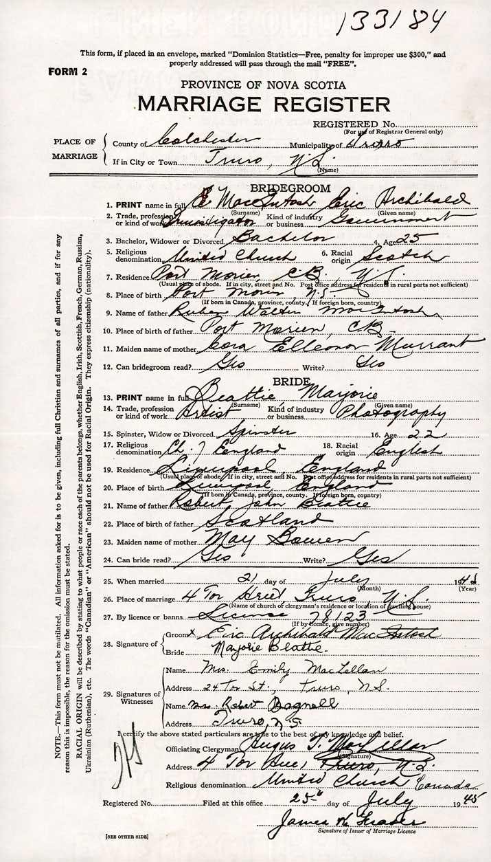 26. Place of marriage 4 Tor Street Truro, Colchester County