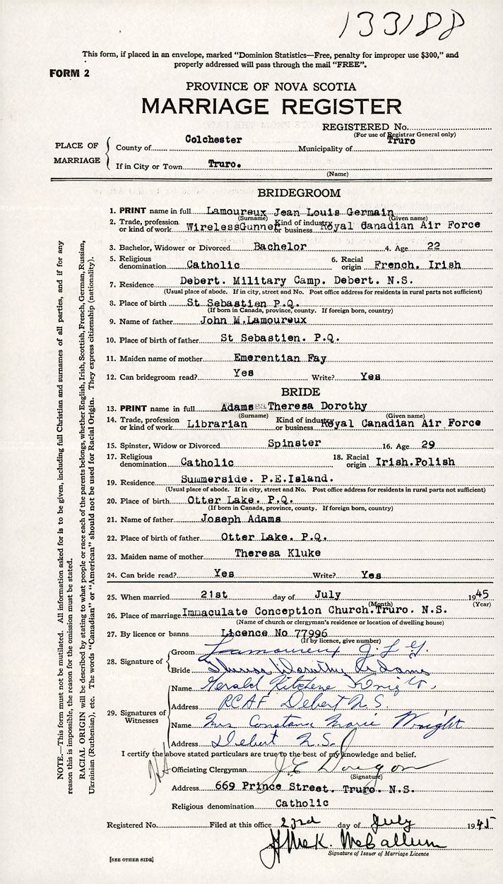 26. Place of marriage Immaculate Conception Church Truro, Colchester County