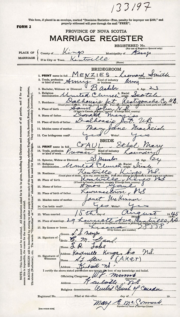 26. Place of marriage 29 Leviette Ave. Kentville, Kings County