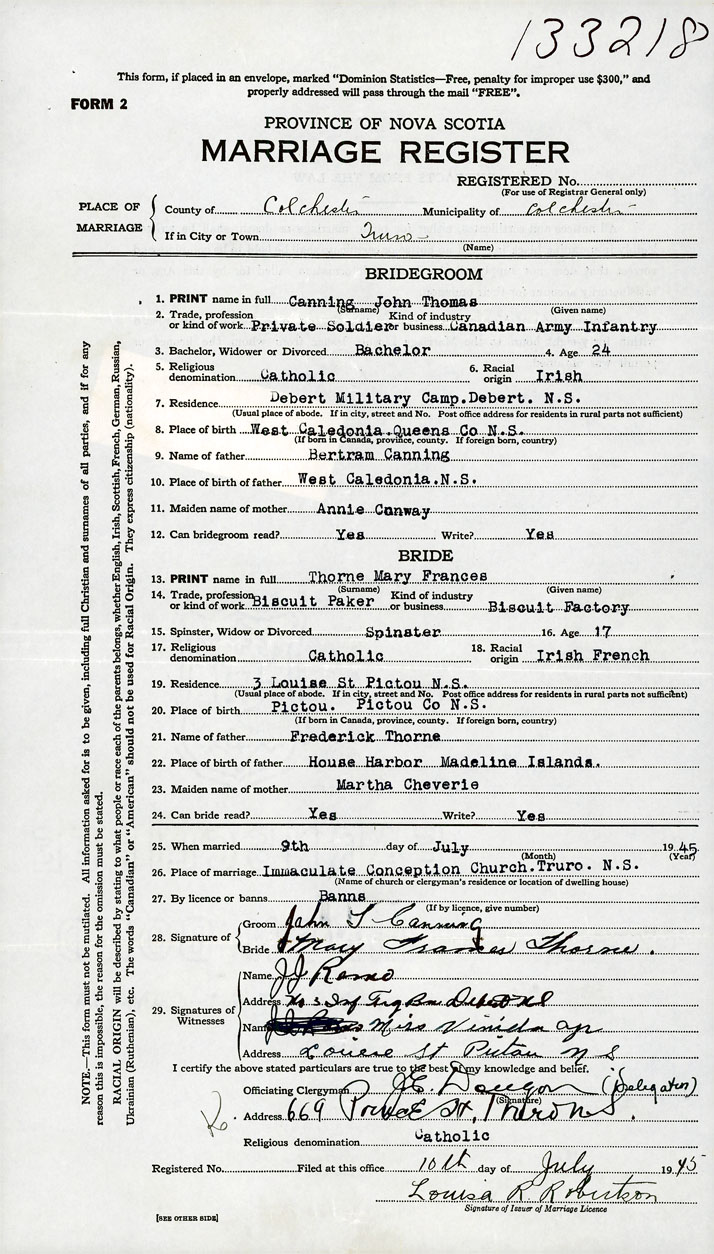 26. Place of marriage immaculate Conception Church Truro, Colchester County