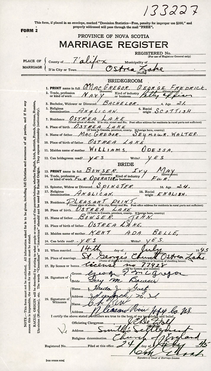 26. Place of marriage St. George’s Church Ostrea Lake, Halifax County