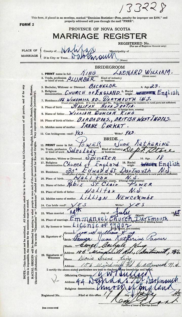 26. Place of marriage Emmanuel Church Dartmouth , Halifax County