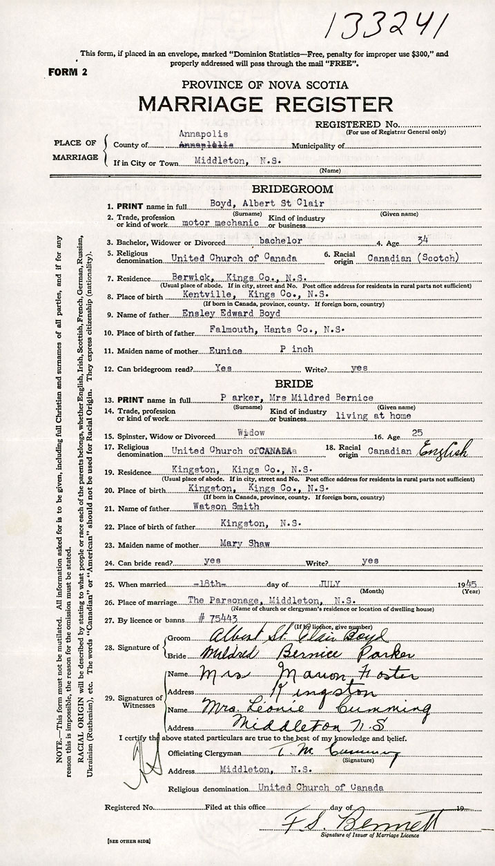 PLACE OF MARRIAGE County of Annapolis in City or Town Middleton