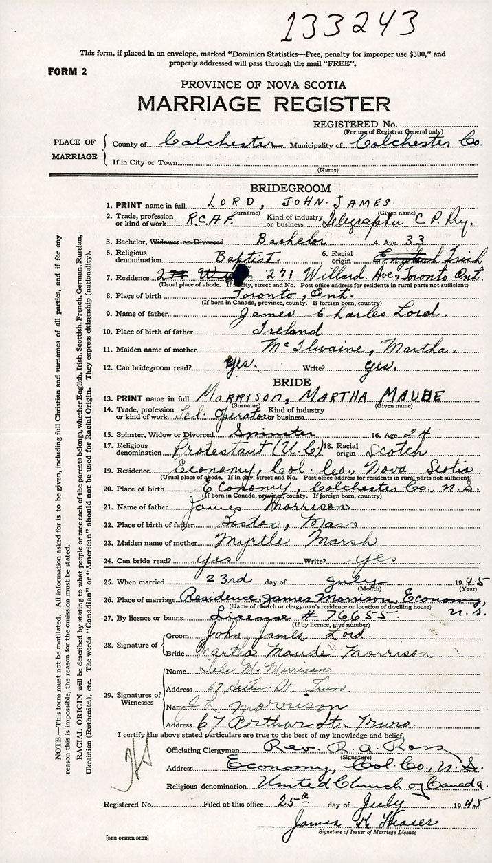 26. Place of marriage Residence: James Morrison Economy, Colchester County