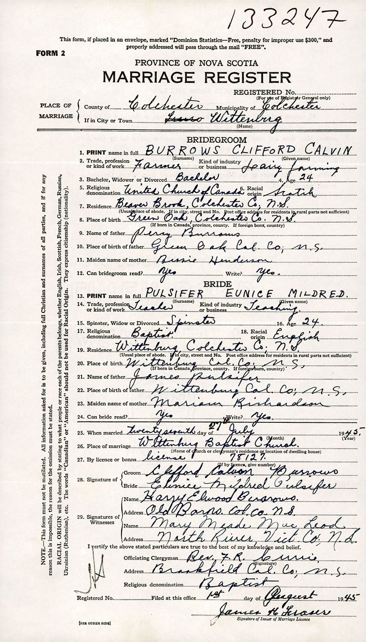 26. Place of marriage Wittenburg Baptist Church Wittenburg, Colchester County
