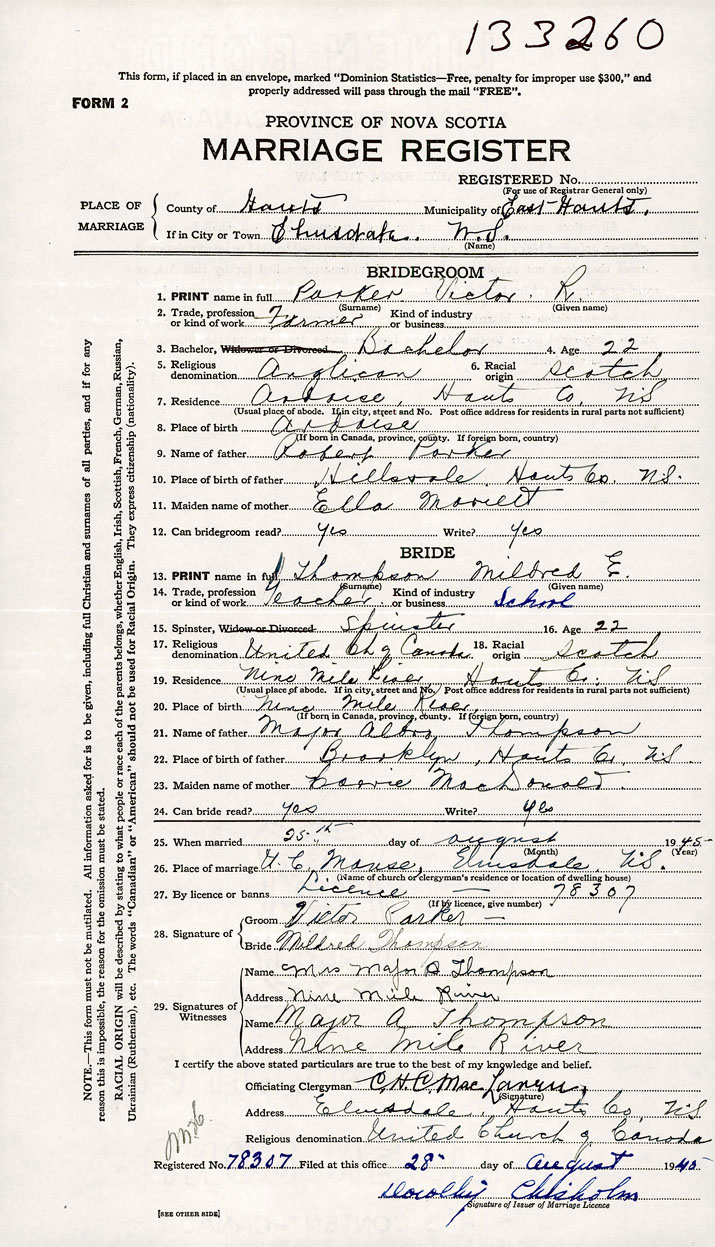26. Place of marriage United Church Manse Elmsdale, Hants County