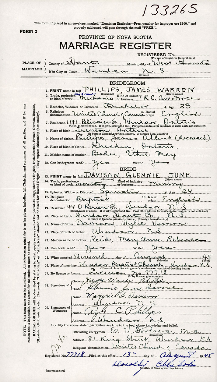 PLACE OF MARRIAGE County of Hants in City or Town Windsor