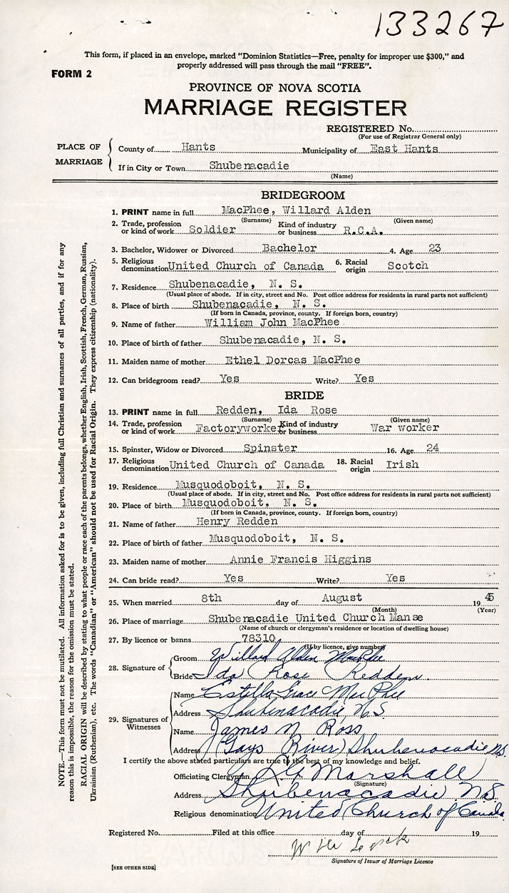 PLACE OF MARRIAGE County of Hants in City or Town Shubenacadie