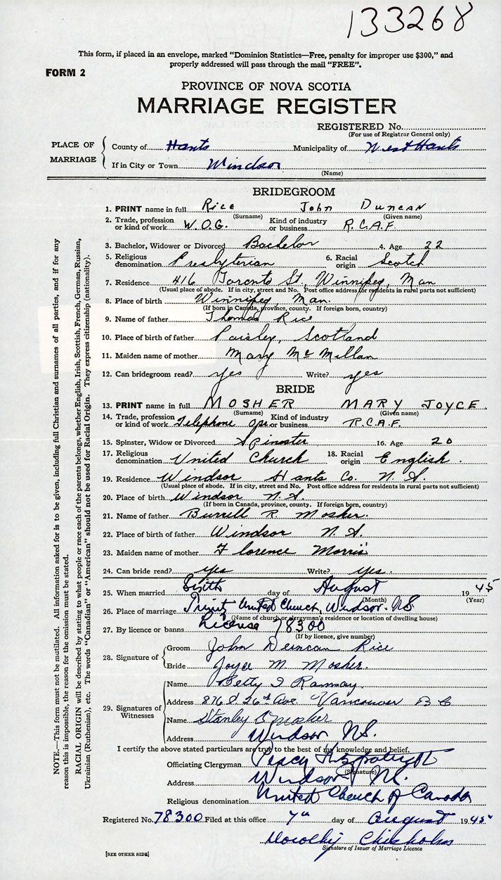 26. Place of marriage Trinity United Church Windsor, Hants County