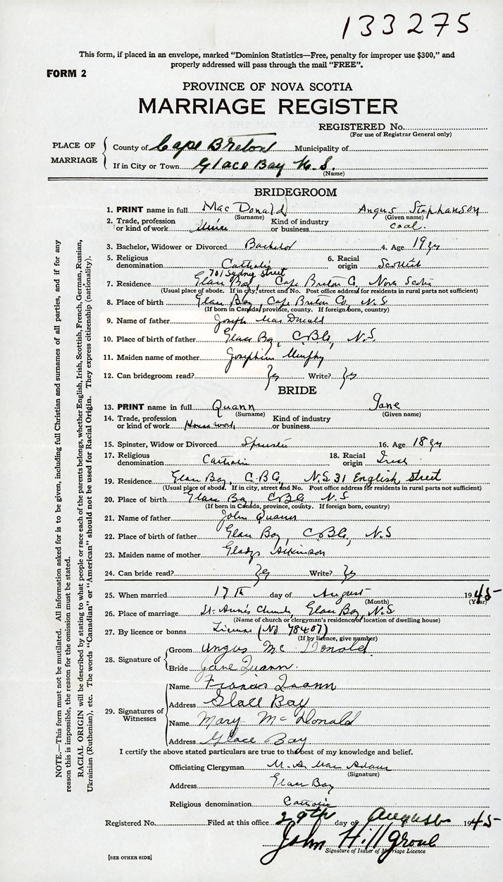 PLACE OF MARRIAGE County of Cape Breton in City or Town Glace Bay