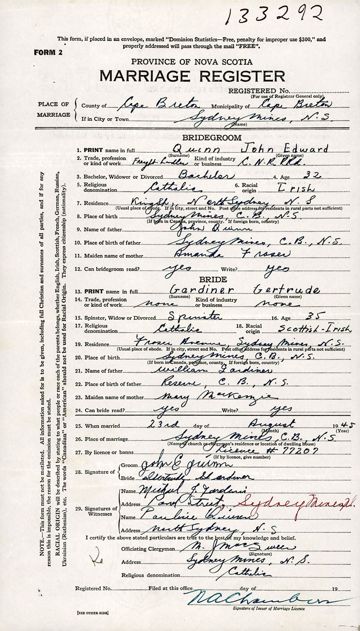 26. Place of marriage Sydney Mines, Cape Breton County