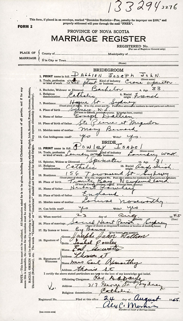 26. Place of marriage Sacred Heart Parish Sydney, Cape Breton County