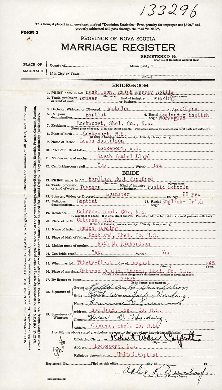 26. Place of marriage Orborne Baptist Church Osborne, Shelburne County