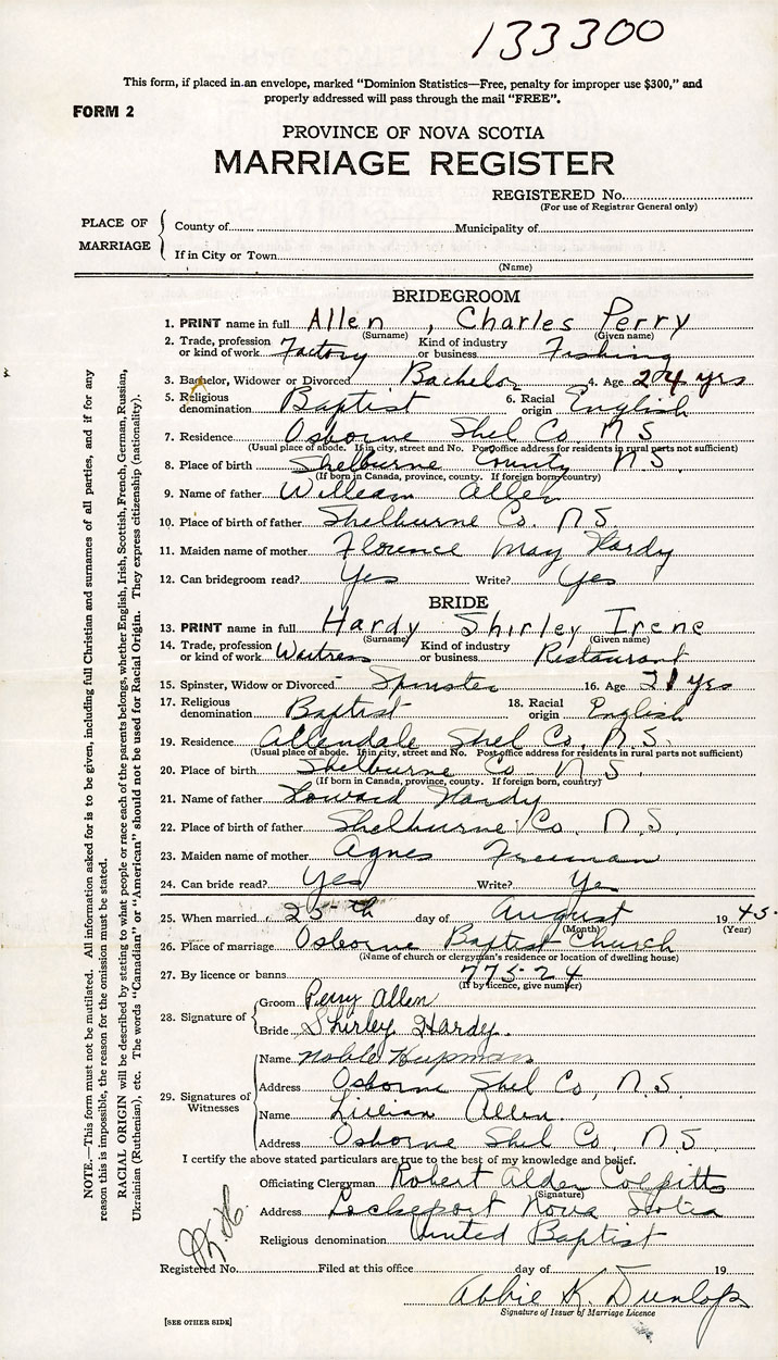 26. Place of marriage Osborne Baptist Church Osborne, Shelburne County