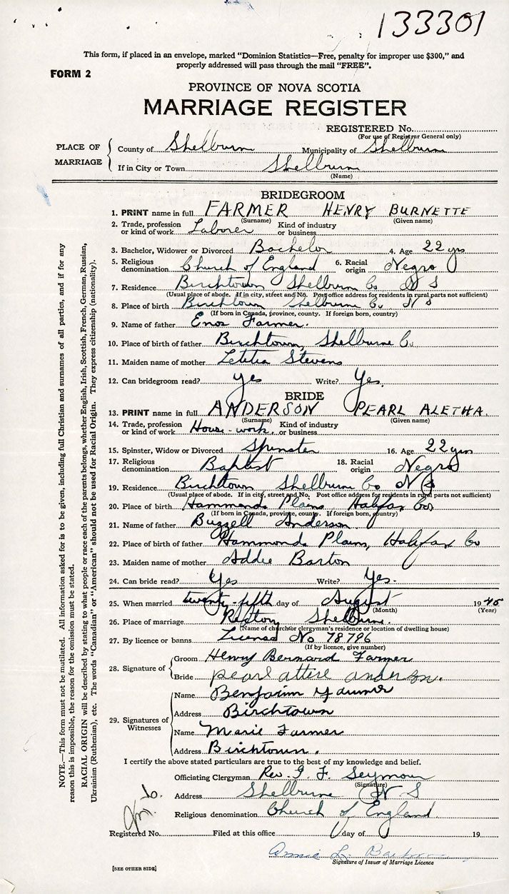 26. Place of marriage Shelburne, Shelburne County