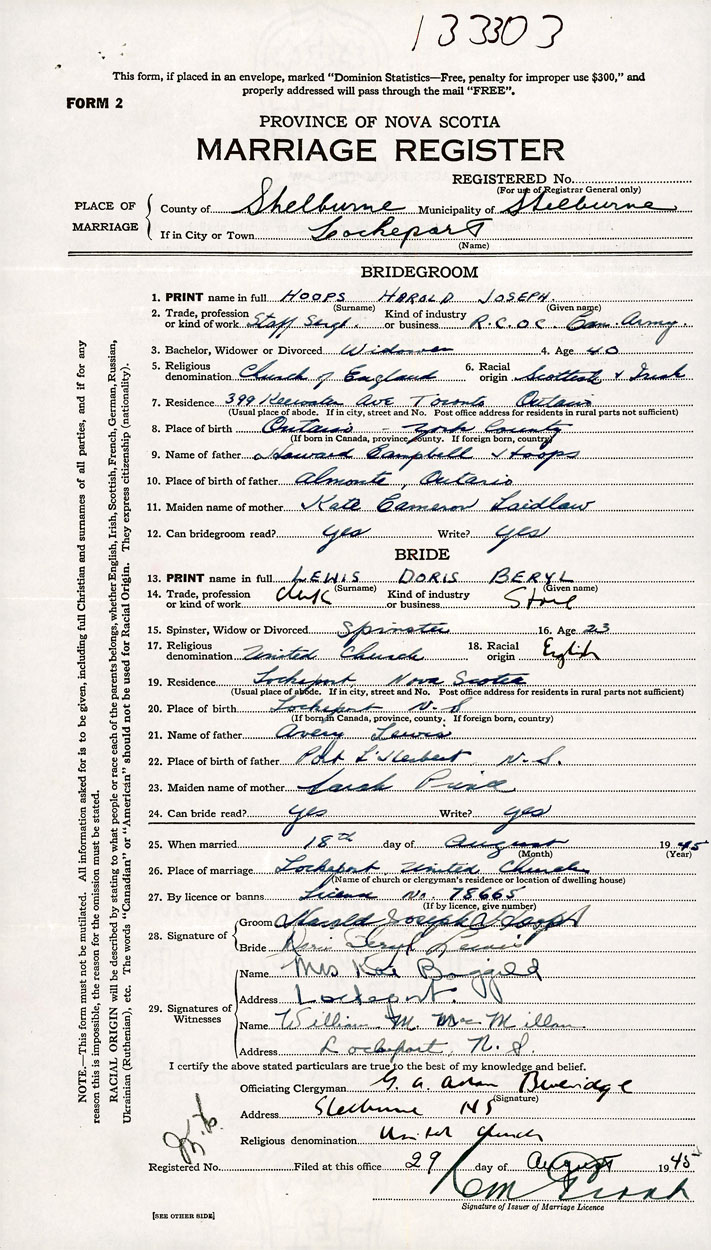 PLACE OF MARRIAGE County of Shelburne in City or Town Lockeport