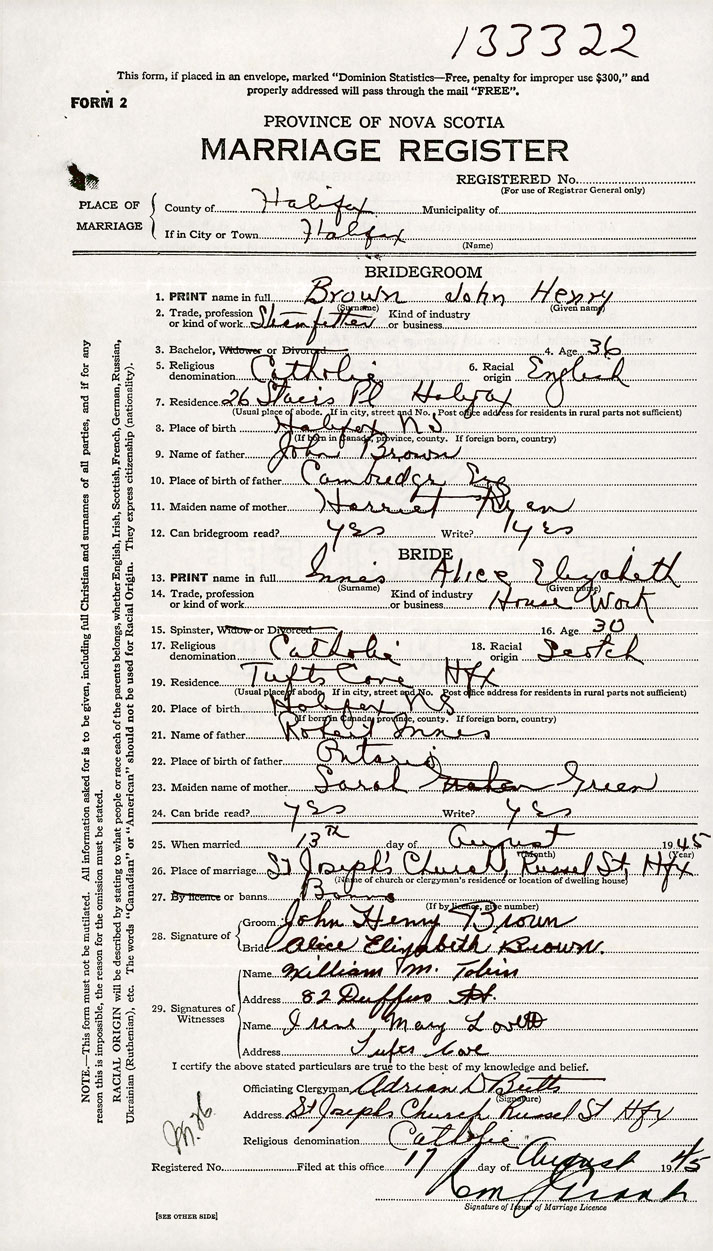 26. Place of marriage St Joseph Church Russel St Halifax , Halifax County