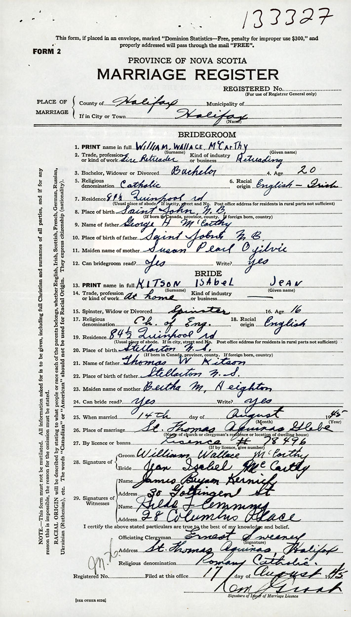 26. Place of marriage St Thomas Aquinas Glebe Halifax , Halifax County