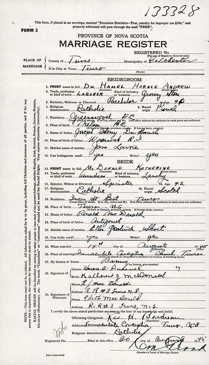 26. Place of marriage Immaculate Conception Church Truro , Colchester County