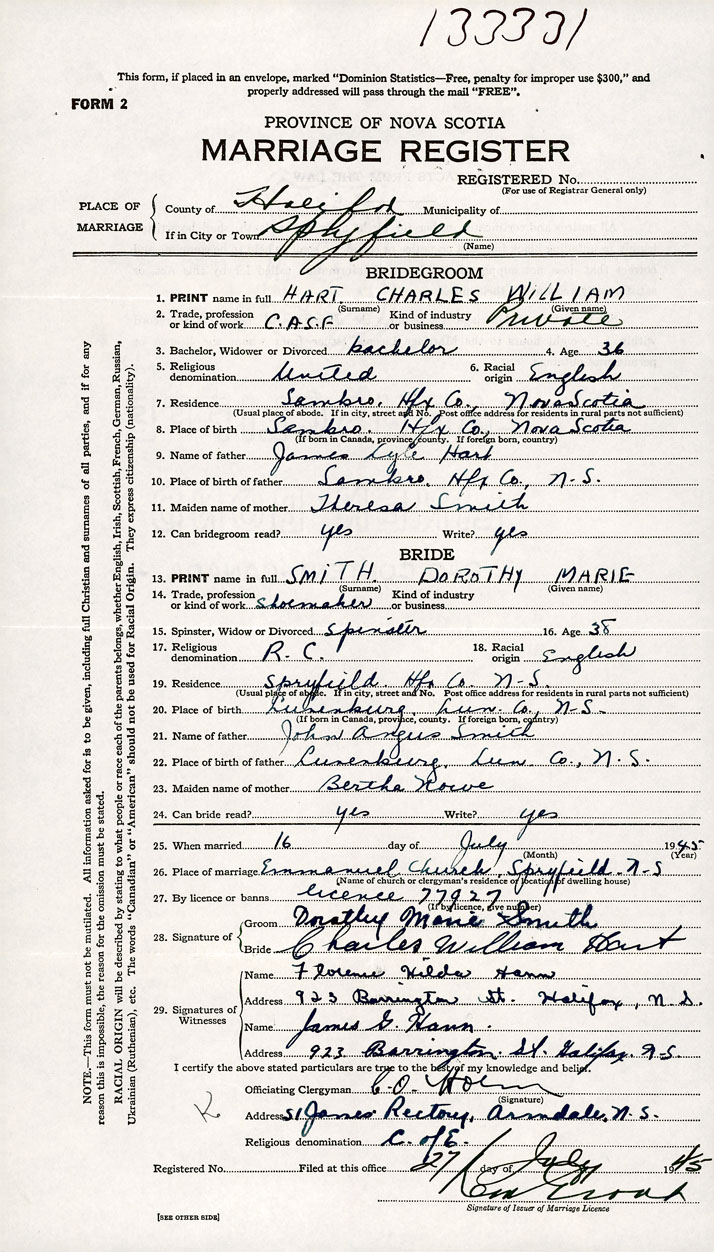 26. Place of marriage Emmanuel Church Spryfield, Halifax County
