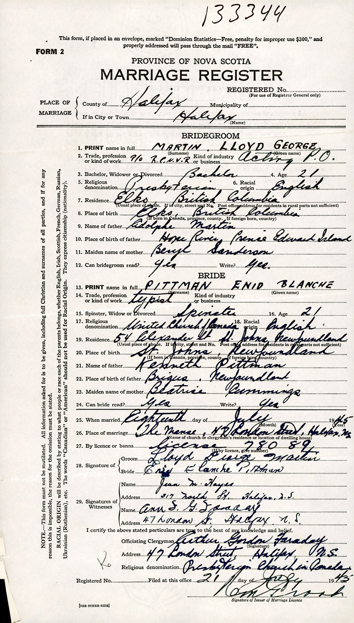 PLACE OF MARRIAGE County of Halifax in City or Town Halifax