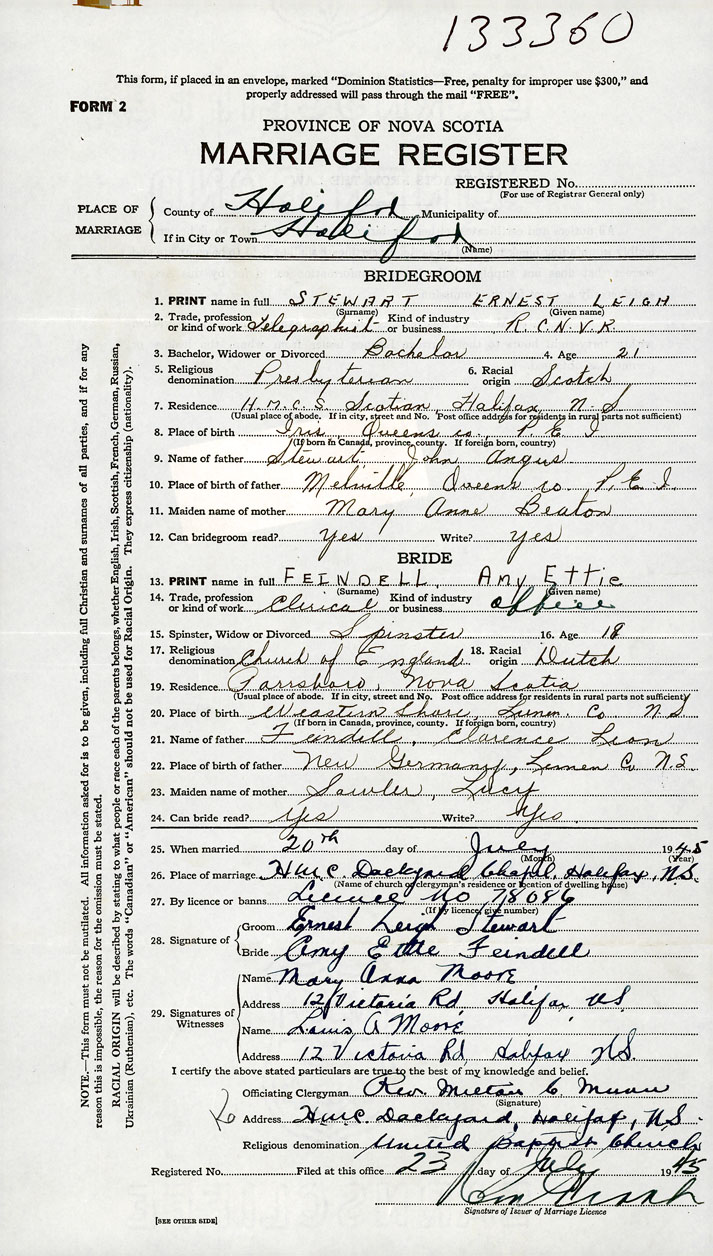 26. Place of marriage HMC. Dockyard Chapel Halifax, Halifax County