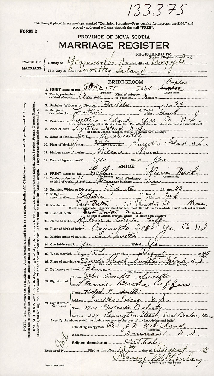 PLACE OF MARRIAGE County of Yarmouth in City or Town Surette's Island