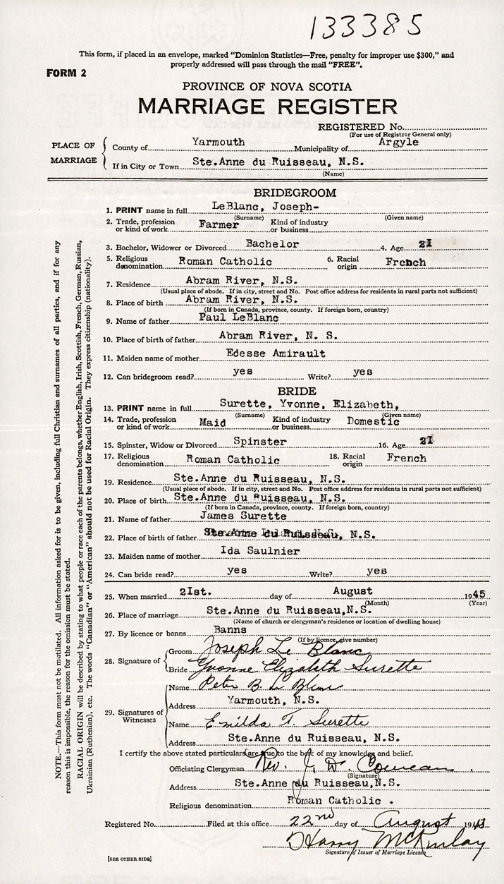 26. Place of marriage Ste. Anne du Ruisseau, Yarmouth County