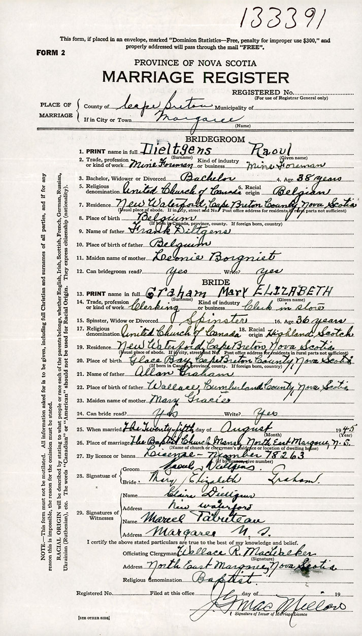 5. Religious denomination United Church of Canada 6. Racial origin Belgian