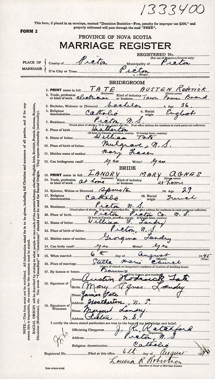 26. Place of marriage Stella Maris Church Pictou , Pictou County