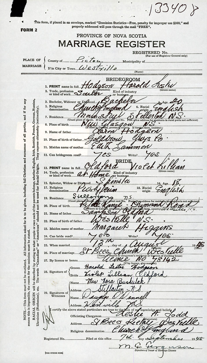 According to a certified copy of the Decree Absolute for Divorce dated 1958-2-7 and filed in the Office of the Registrar General under Divorce number 1642, it is ordered that the marriage of Harold Lester Hodgson and Violet Lillian Oldford (Registered under marriage number 1945-133408) be null and void.