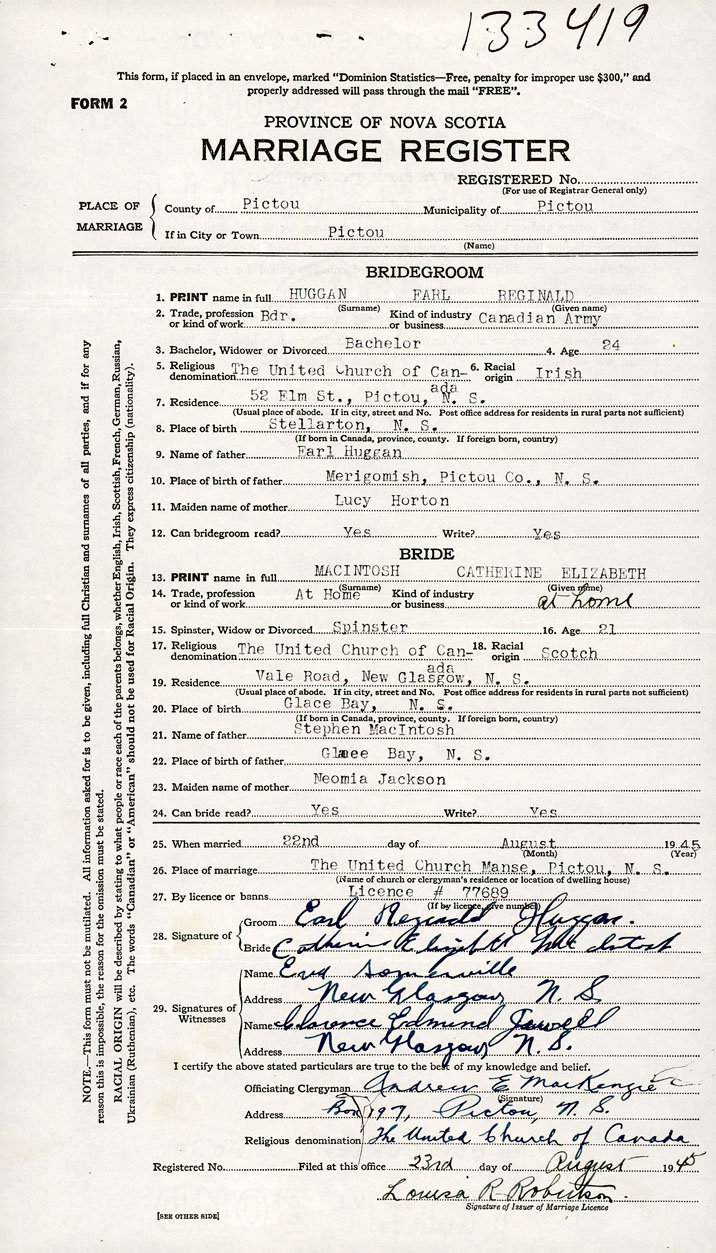According to a certified copy of the Decree Absolute for Divorce dated 1957-9-13 and filed in the Office of the Registrar General under Divorce number 1545, it is ordered that the marriage of Earl Reginald Huggan and Catherine MacIntosh (Registered under marriage number 1945-133419) be null and void.