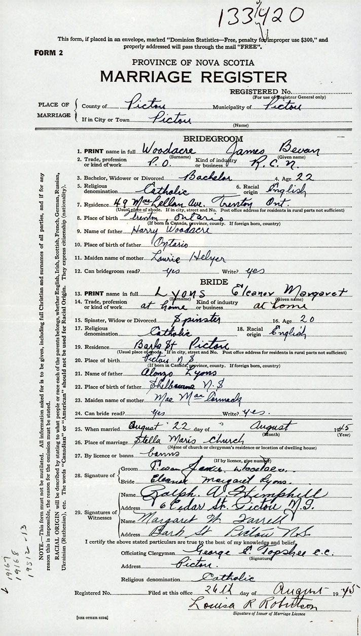 26. Place of marriage Stella Maris Church Pictou, Pictou County