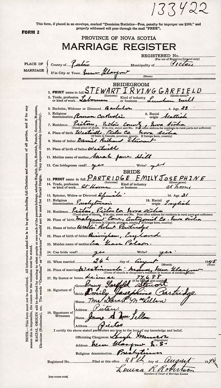 26. Place of marriage New Glasgow , Pictou County