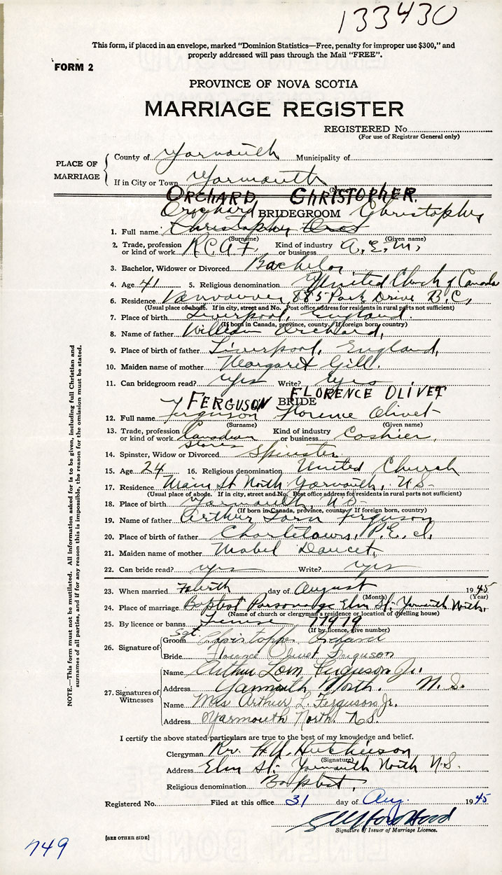 26. Place of marriage Elm Street Yarmouth, Yarmouth County