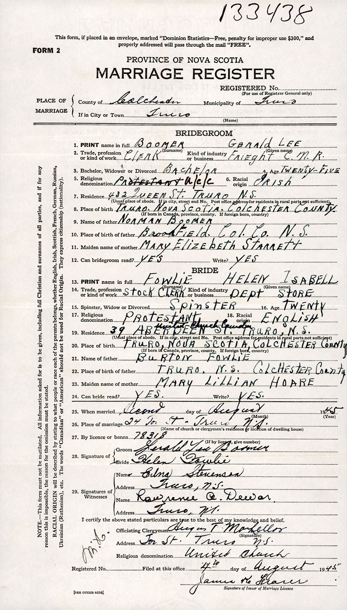 26. Place of marriage 24 Tor St. Truro, Colchester County