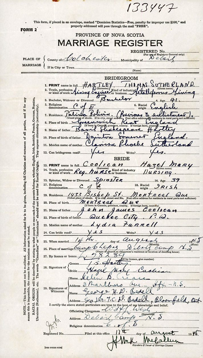PLACE OF MARRIAGE County of Colchester in City or Town Debert Camp