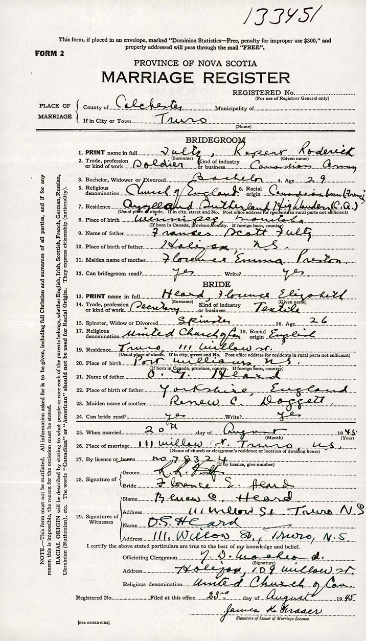 26. Place of marriage 111 Willow Street Truro, Colchester County