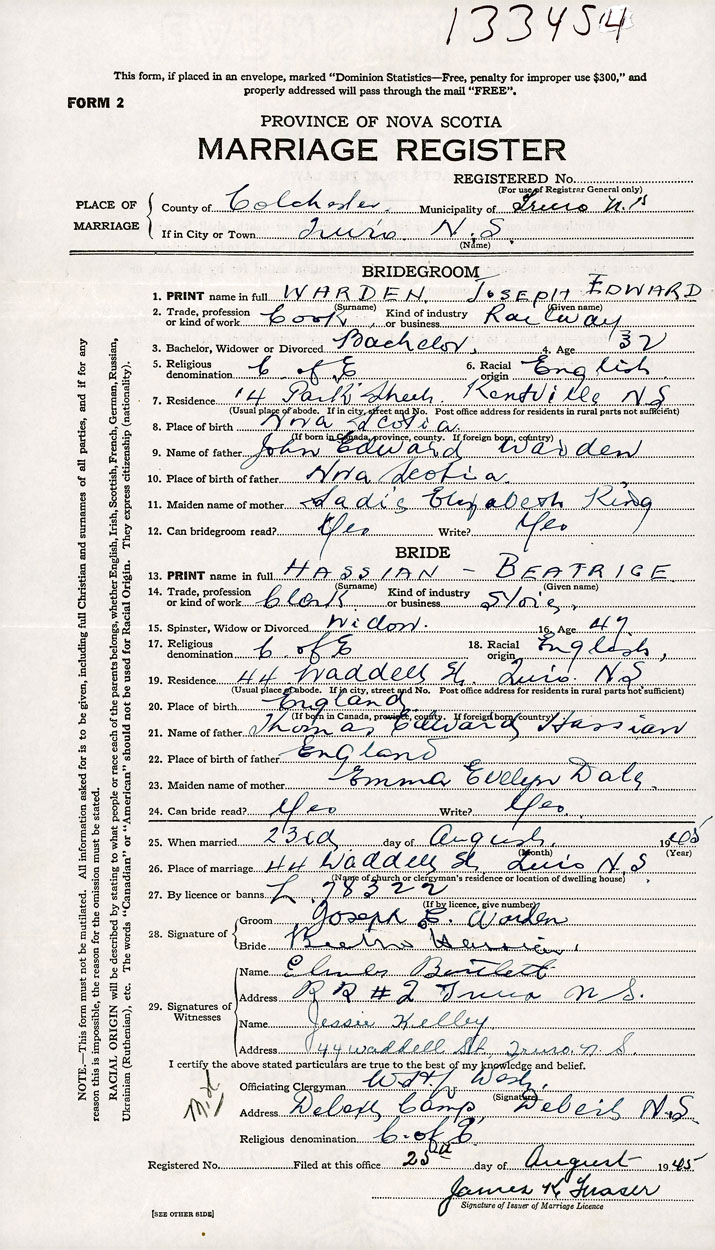 26. Place of marriage 44 Waddell St Truro , Colchester County