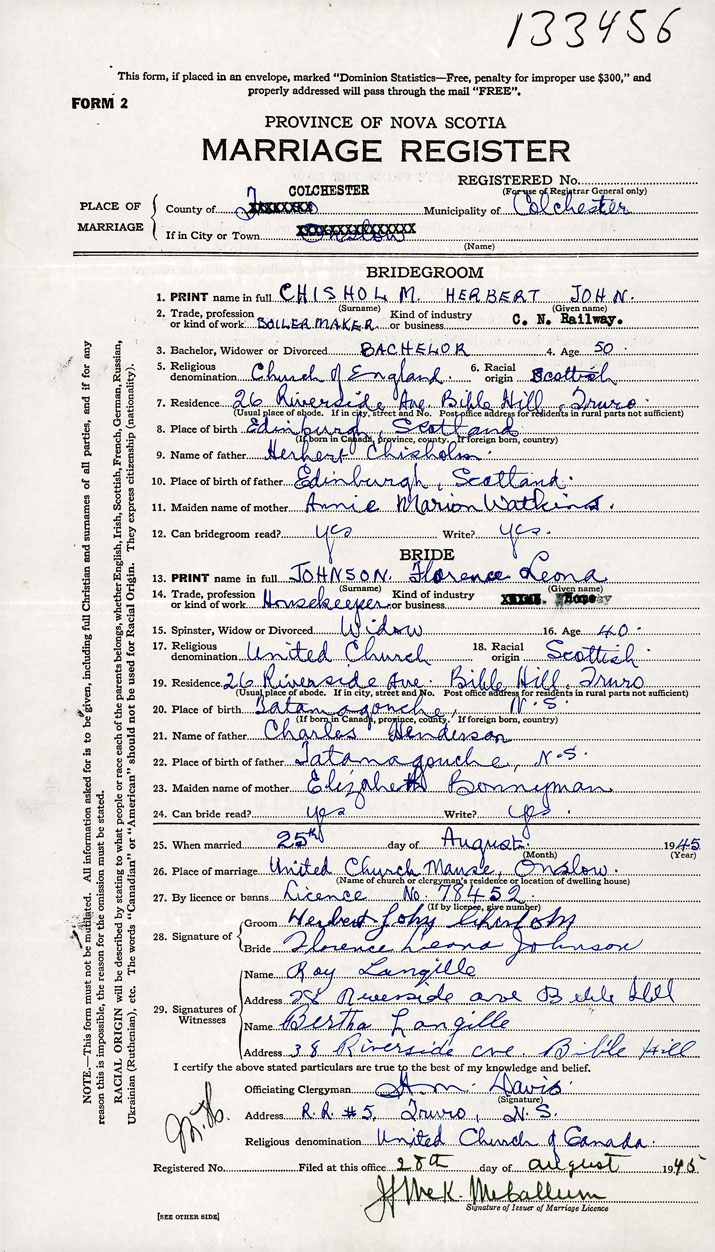 26. Place of marriage United Church Manse Onslow, Colchester County