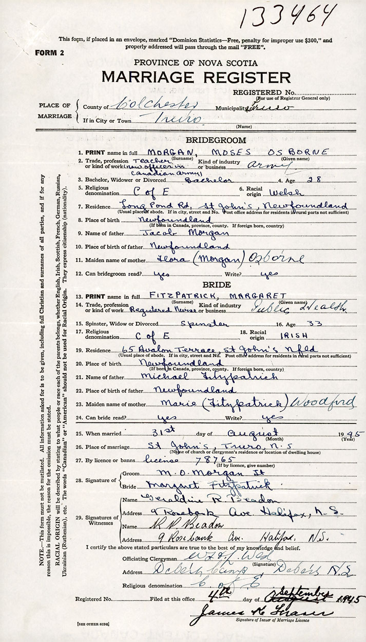 26. Place of marriage St John's Truro, Colchester County
