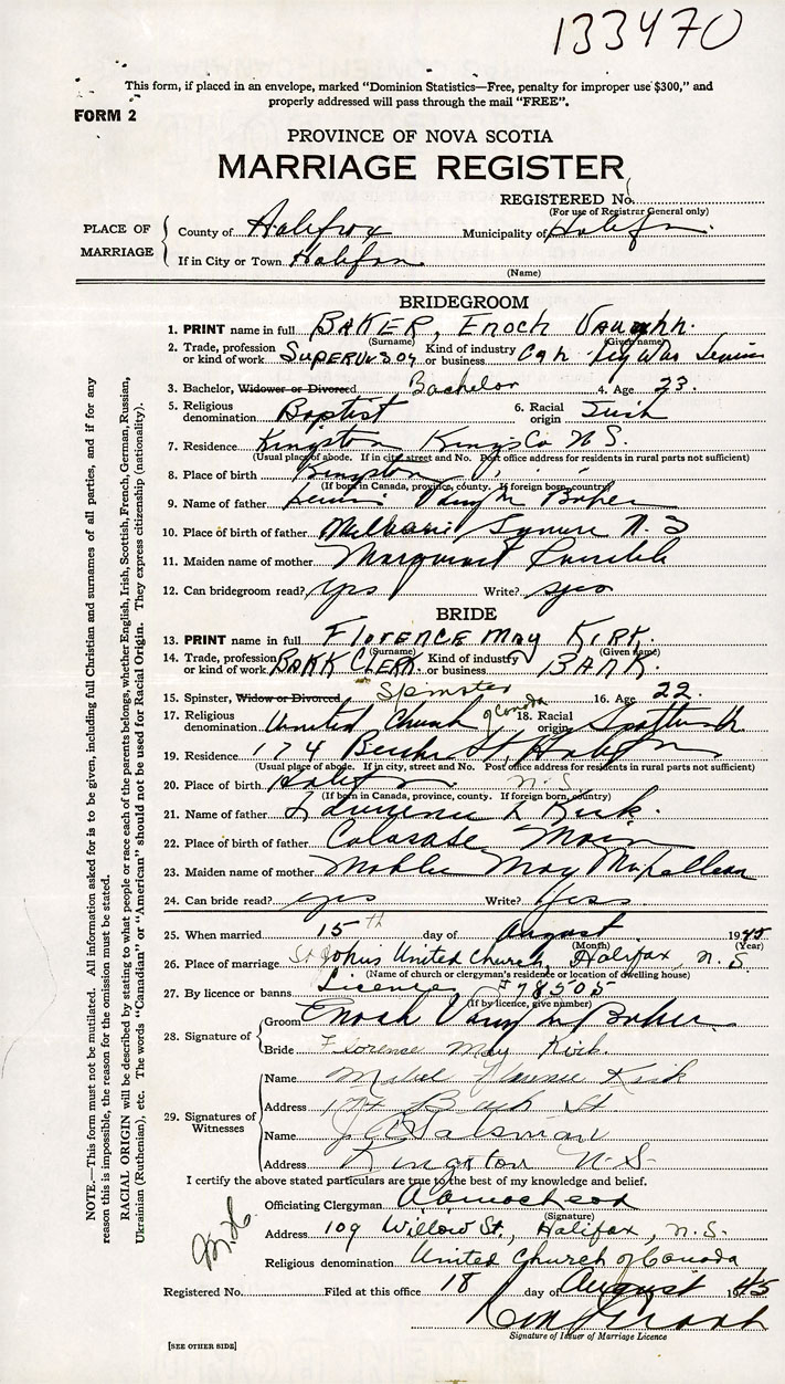 26. Place of marriage St. John''s United Church Halifax, Halifax County