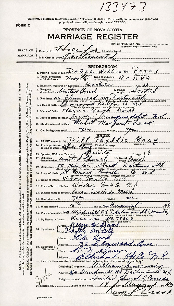 26. Place of marriage 154 Windmill Rd (Manse) Dartmouth, Halifax County
