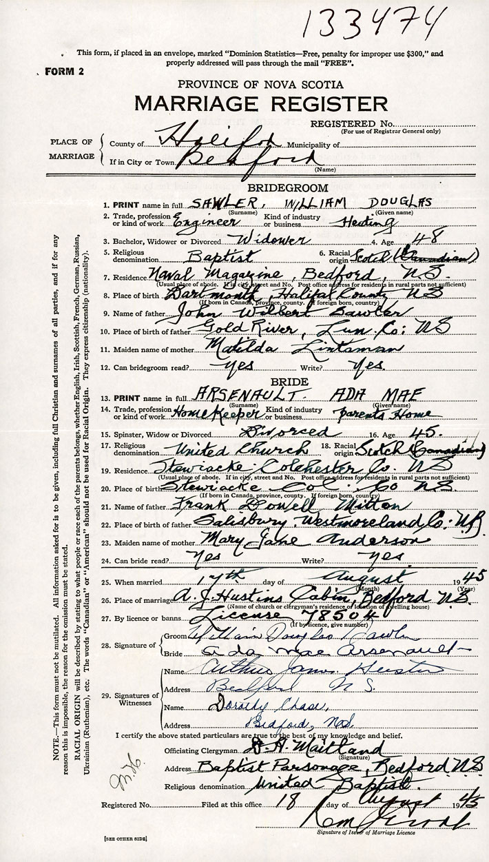PLACE OF MARRIAGE County of Halifax in City or Town Bedford