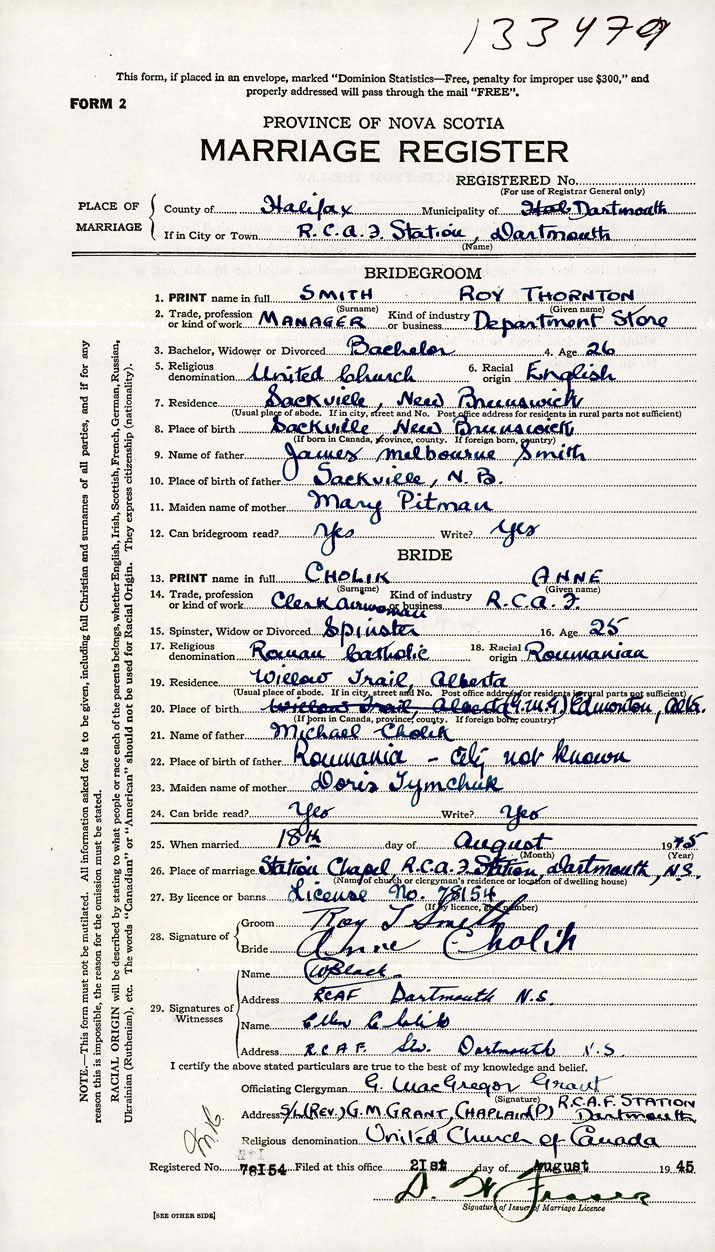 26. Place of marriage Station Chapel RCAF Dartmouth , Halifax County