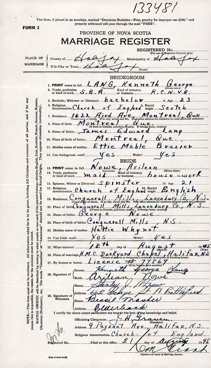 26. Place of marriage H.M.C. Dockyard Chapel Halifax, Halifax County