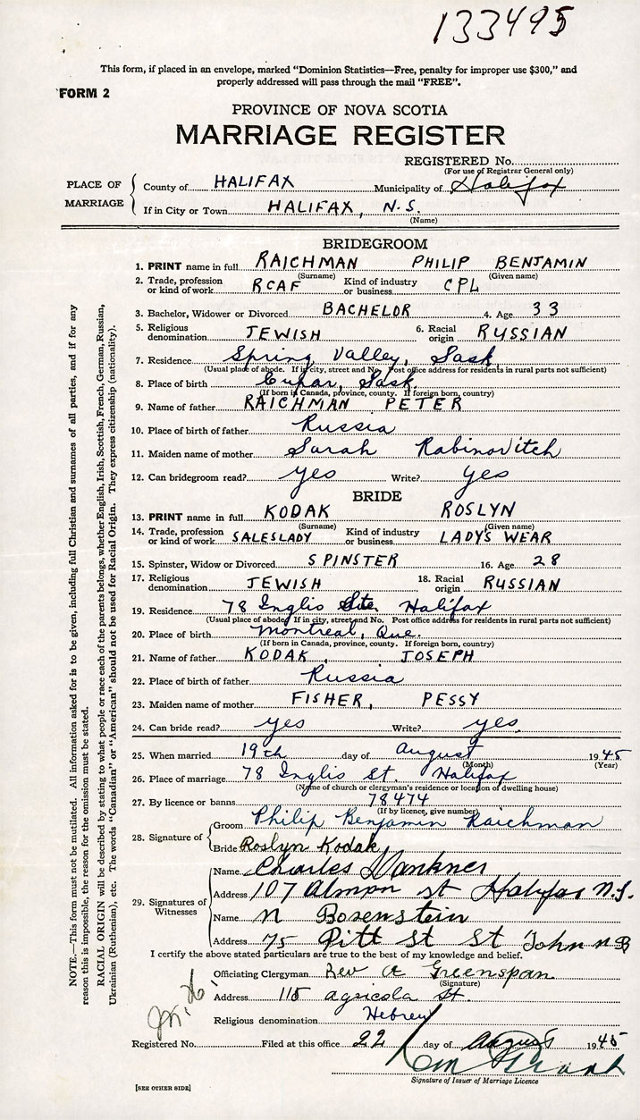26. Place of marriage 78 Inglis Street Halifax, Halifax County